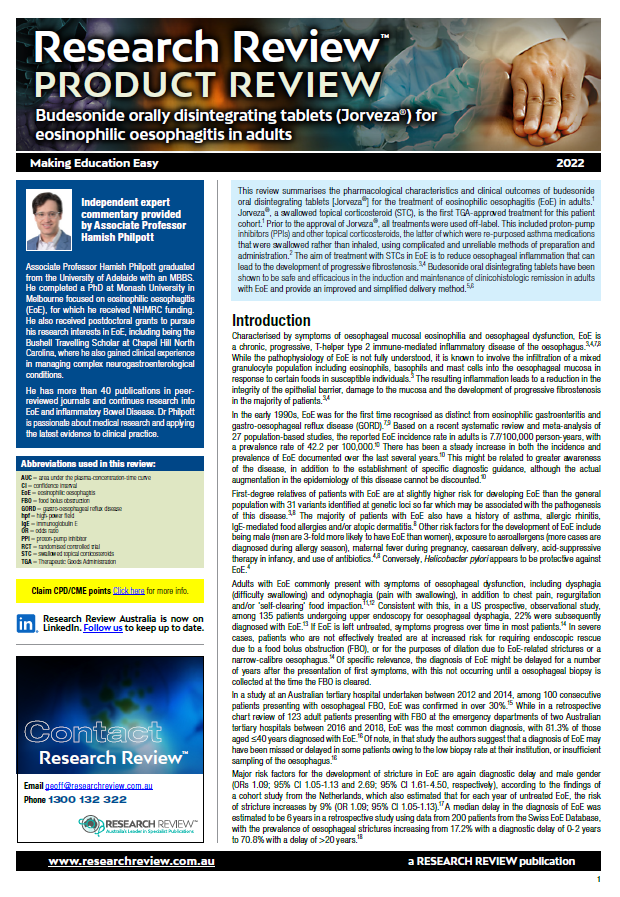 As part of our ongoing series focussing on new registrations in Australia, we have added a product review of the use of Budesonide orally disintegrating tablets for eosinophilic oesophagitis in adults.