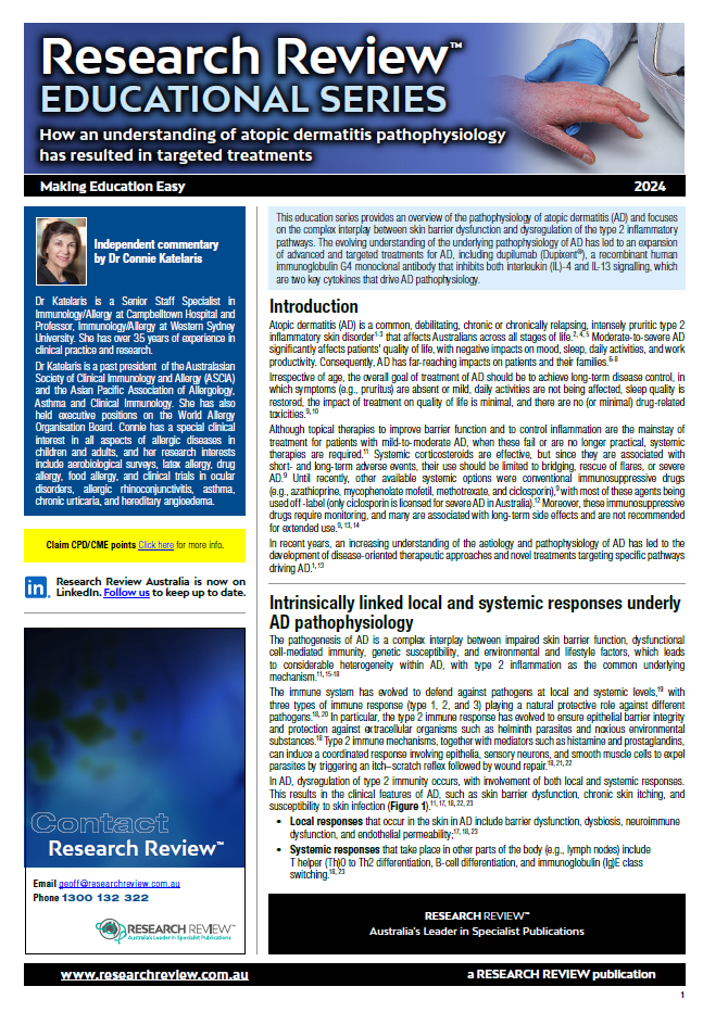 The review covers the pathophysiology of atopic dermatitis and focuses on the complex interplay between skin barrier dysfunction and dysregulation of the type 2 inflammatory pathways. It also includes guiding commentary from Dr Connie Katelaris, Head of Unit, Immunology & Allergy, Campbelltown Hospital.