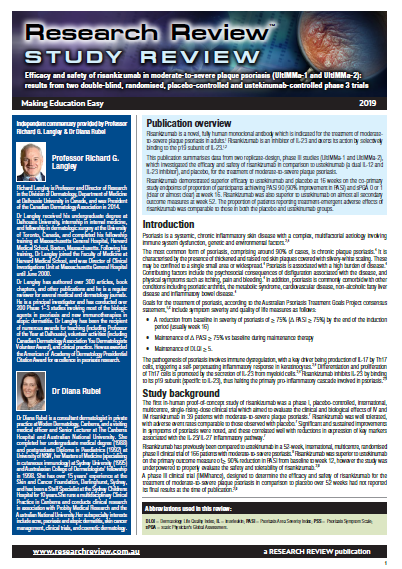 Commentary is provided by Professor Richard Langley, Professor and Director of Research in the Division of Dermatology, Department of Medicine at Dalhousie University in Canada, and was President of the Canadian Dermatology Association in 2014, and Dr Diana Rubel, a consultant dermatologist in private practice at Woden Dermatology, Canberra, and a visiting medical officer and Senior Lecturer at The Canberra Hospital and Australian National University.