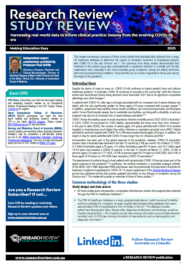 Independent commentary for the review has been provided by Professor Paul Griffin, Infectious Diseases Physician and Clinical Microbiologist, Director of Infectious Diseases at Mater Health Services and Head of the Mater Clinical Unit, University of Queensland School of Medicine.