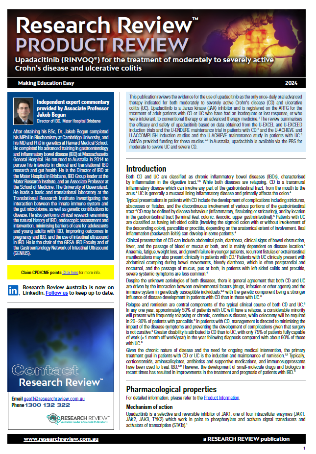 This publication focuses on the efficacy and safety of upadacitinib and provides commentary from Associate Professor Jakob Begun, Director of IBD at the Mater Hospital in Brisbane and an Associate Professor at the School of Medicine, The University of Queensland.