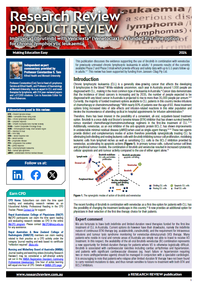 This review discusses the evidence supporting the use of ibrutinib in combination with venetoclax for previously untreated chronic lymphocytic leukaemia in adults. It provides commentary from Professor Con Tam, Head of the Lymphoma Service at Alfred Health, and Professor of Haematology at Monash University.
