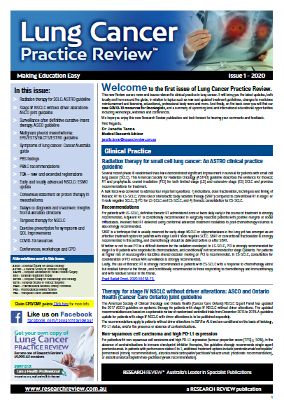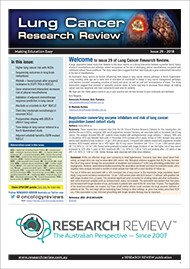 This Review features key medical articles from global oncology journals with commentary from Associate Professor Nick Pavlakis, Dr Csilla Hasovits and Dr Malinda Itchins. The Review covers topics such as small cell lung cancer, NSCLC, lung cancer staging, bronchogenic carcinoma, lung cancer screening, mesothelioma, bronchoscopy, surgical resection, chemotherapeutic agents, EGFR-TKIs, and palliative care.