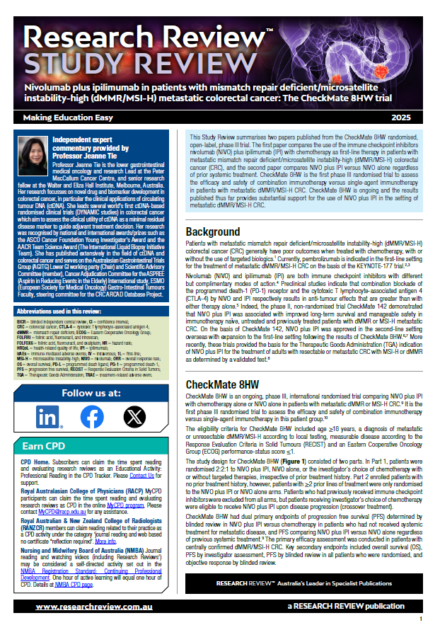 Independent commentary for the review has been provided by Professor Jeanne Tie who is the lower gastrointestinal medical oncology and research Lead at the Peter MacCallum Cancer Centre, and senior research fellow at the Walter and Eliza Hall Institute, Melbourne, Australia.