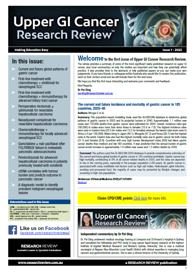 Dr Pei Ding.The Review covers topics such as gastric cancer, biliary tract cancer, hepatocellular carcinoma, oesophageal squamous cell carcinoma, and pancreatic adenocarcinoma.