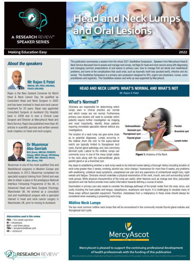 This publication summarises a session from the virtual 2021 Goodfellow Symposium. Speakers from MercyAscot Head & Neck Service discussed how to assess and manage neck lumps, red flags for head and neck cancers along with diagnosing and managing common presentations of oral lesions in primary care, how to manage first aid dental and maxillofacial problems, and some of the complications that could arise, such as traumatic tooth loss (avulsed tooth), infection and dry socket. The Goodfellow Symposium is a primary care symposium designed for GPs, urgent care physicians, nurses, nurse practitioners and registrars. This Goodfellow session and write up was supported by MercyAscot.