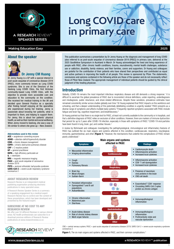 This publication summarises a presentation by Dr Jenny Huang on the diagnosis and management of long COVID (also referred to as post-acute sequelae of coronavirus disease-2019 [PASC]) in primary care, delivered at the 2025 Goodfellow Symposium in Auckland in March. Dr Huang acknowledged the lived and living experience of people with PASC, other chronic health conditions, trauma, neurodiversity, mental health challenges, substance use or addiction, disability, family violence, and their families, carers and supporters. Dr Huang and colleagues are grateful for the contribution of their patients who have shared their perspectives and contributed as equal and active partners in improving the health of all people.
