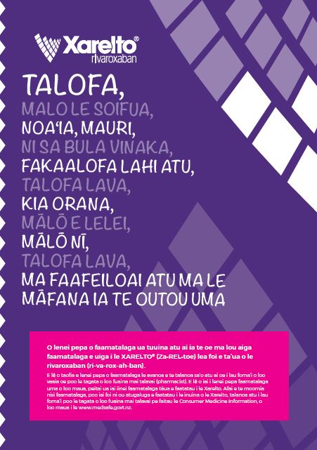 This information sheet is for you and your family/whānau/ aiga/kâinga and gives you information about XARELTO® (Za•REL•toe) also known as rivaroxaban (ri-va-rox-ah-ban).