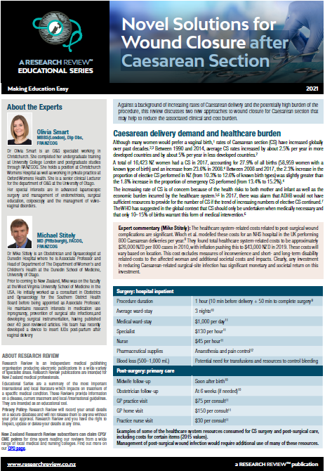 Against a background of increasing rates of Caesarean delivery and the potentially high burden of the procedure, this review discusses two new approaches to wound closure for Caesarean section that may help to reduce the associated clinical and cost burden.
