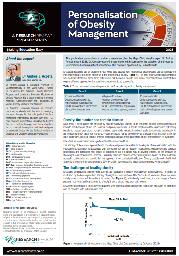 This publication summarises an online presentation given by Mayo Clinic obesity expert Dr Andres Acosta in April 2023. Dr Acosta presented a case study led discussion on the selection of anti-obesity interventions based on patient phenotypes. This review is sponsored by Radiant Health.