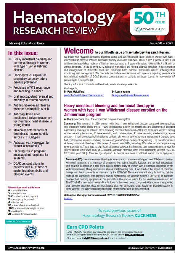 This Review features key medical articles from global blood journals with commentary from Dr Paul Ockelford and Dr Laura Young. The Review covers topics such as haemophilia, bone marrow and stem cell transplantation, anaemia, anticoagulation therapy and anti-platelet therapy.