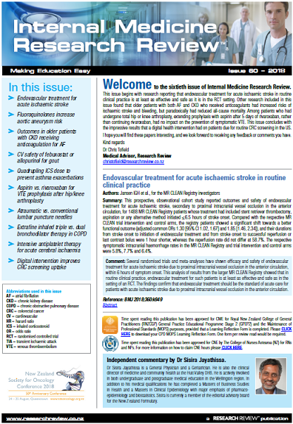 This Review features key medical articles from global internal medicine journals with commentary from Dr Sisira Jayathissa and Dr Xaviour Walker. The Review covers topics such as critical care medicine, endocrinology, gastroenterology, geriatrics, haematology, infectious diseases, interventional cardiology, medical oncology, nephrology, pulmonology and rheumatology.