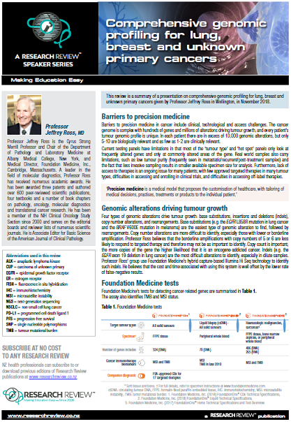 This review is a summary of a presentation on comprehensive genomic profiling for lung, breast and