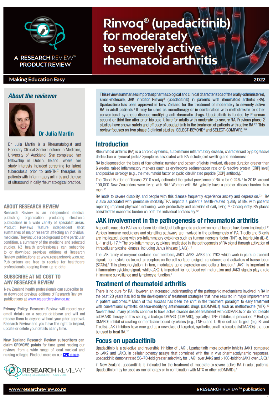 This review summarises important pharmacological and clinical characteristics of the orally-administered, small-molecule, JAK inhibitor Rinvoq® (upadacitinib) in patients with rheumatoid arthritis (RA). Upadacitinib has been approved in New Zealand for the treatment of moderately to severely active RA in adult patients. It may be used as monotherapy or in combination with methotrexate or other conventional synthetic disease-modifying anti-rheumatic drugs. Upadacitinib is funded by Pharmac second or third line after prior biologic failure for adults with moderate-to-severe RA. Previous phase 2 studies have shown safety and efficacy of upadacitinib in the treatment of patients with active RA. This review focuses on two phase 3 clinical studies, SELECT-BEYOND and SELECT-COMPARE.