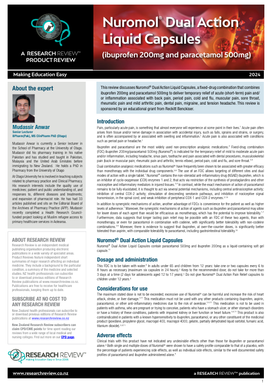 This review discusses Nuromol® Dual Action Liquid Capsules, a fixed-drug combination that combines ibuprofen 200mg and paracetamol 500mg to deliver temporary relief of acute (short-term) pain and/or inflammation associated with back pain, period pain, cold and flu, muscular pain, sore throat, rheumatic pain and mild arthritic pain, dental pain, migraine, and tension headache. This review is sponsored by an educational grant from Reckitt Benckiser.