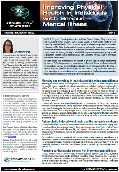 The 2018 Congress of the Royal Australian and New Zealand College of Psychiatrists was held in Auckland in May. Dr Jackie Curtis, Clinical Director of Youth Mental Health at South Eastern Sydney Local Health District, Australia, spoke at a breakfast symposium sponsored by Janssen on May 17th. She highlighted the current evidence for prevention, screening and intervention in cardiometabolic health of individuals with serious mental illness. She focused in particular on the Keeping the Body in Mind (KBIM) programme operating in Sydney, as well as discussing practical tools to assist clinicians with addressing physical health in individuals with serious mental illness.