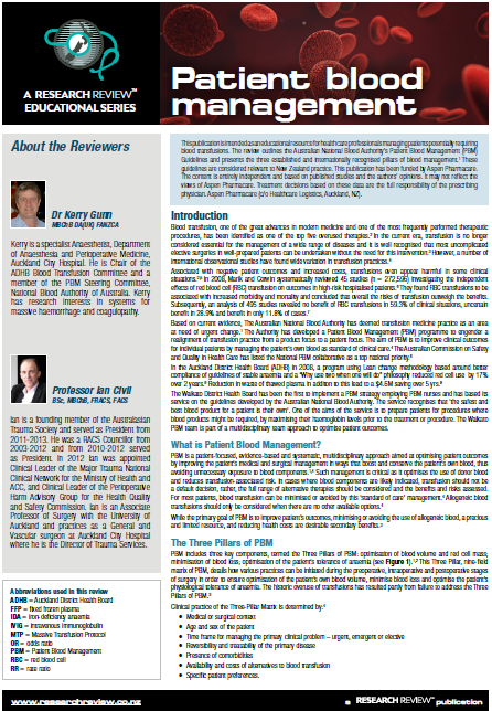 This publication is intended as an educational resource for health care professionals managing patients potentially requiring blood transfusions. The review outlines the Australian National Blood Authority’s Patient Blood Management (PBM) Guidelines and presents the three established and internationally recognised pillars of blood management. These guidelines are considered relevant to New Zealand practice. This publication has been funded by Aspen Pharmacare. The content is entirely independent and based on published studies and the authors’ opinions. It may not reflect the views of Aspen Pharmacare. Treatment decisions based on these data are the full responsibility of the prescribing physician. Aspen Pharmacare (c/o Healthcare Logistics, Auckland, NZ).